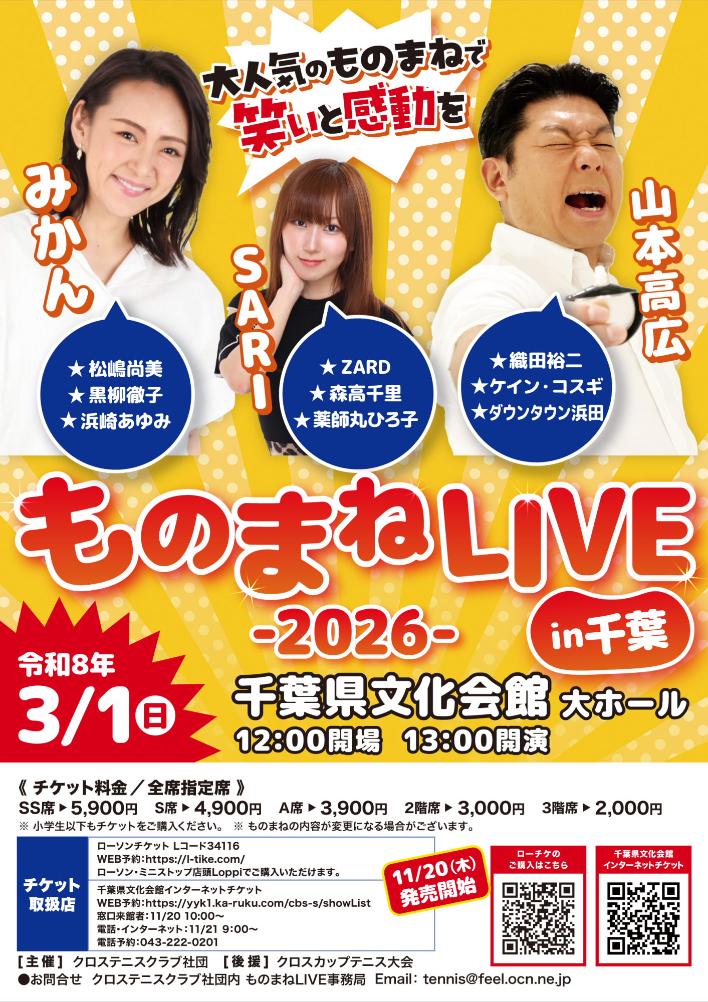 お問合せ クロステニスクラブ社団内 ものまねLIVE事務局 Email:tennis@feel.ocn.ne.jp